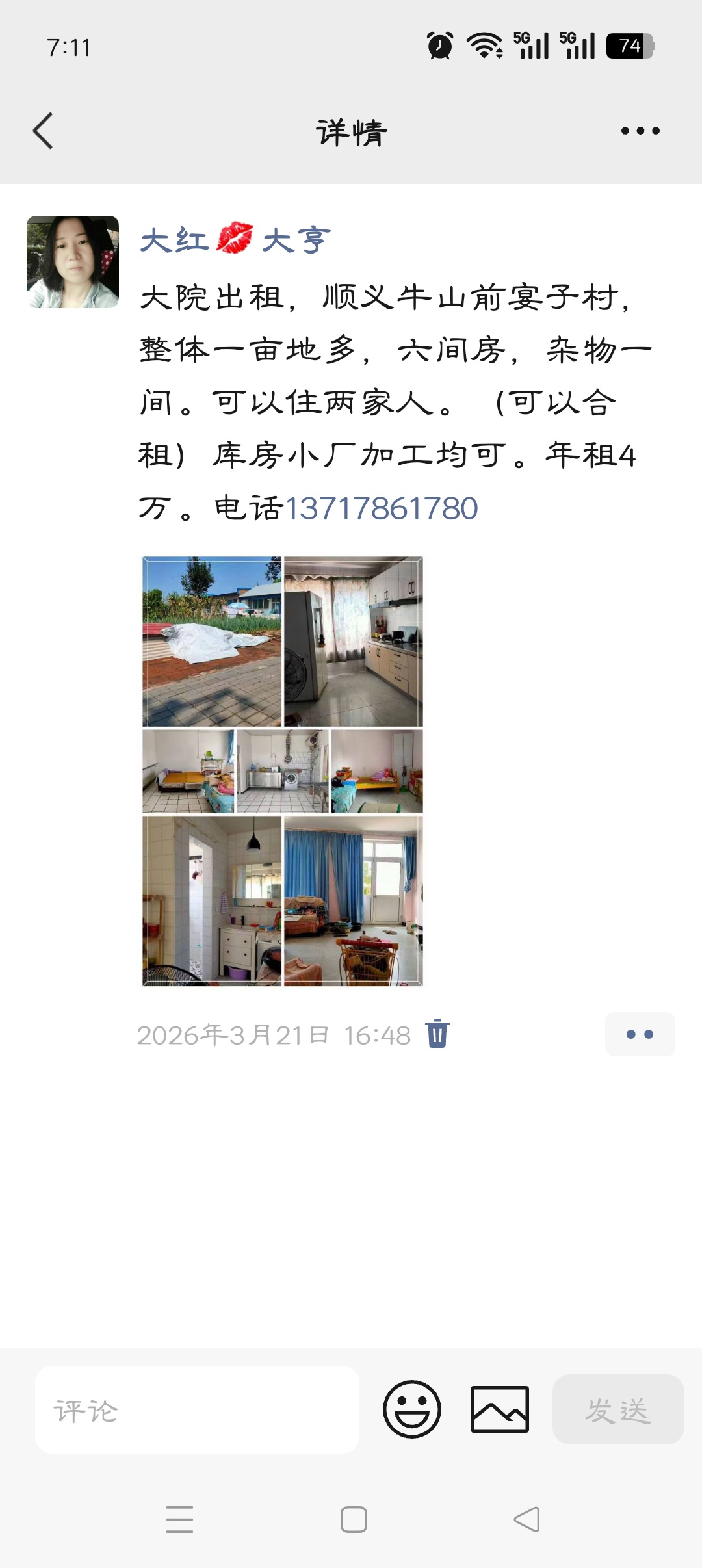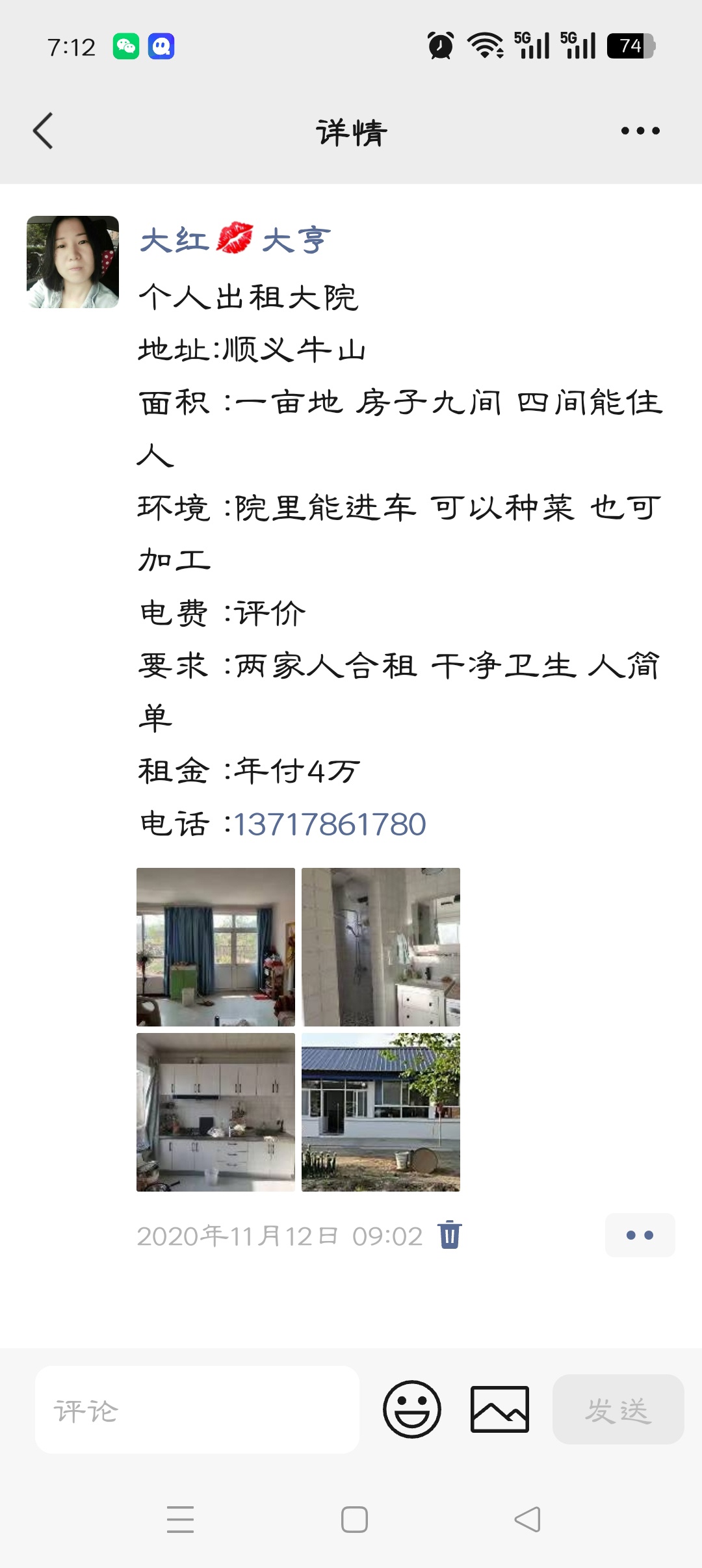 大院出租,顺义牛山前宴子村,整体一亩地多,六间房,杂物一间。可以住两家人。(可以合租)库房小厂加工均可。年租4万。